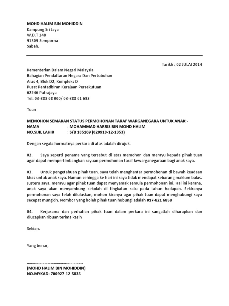 Kdn Contoh Surat Rayuan Permohonan Kewarganegaraan Malaysia