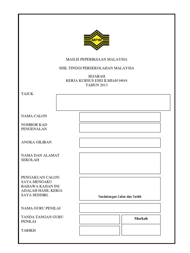Majlis peperiksaan malaysia mpm yang ditubuhkan pada 1 februari 1980 di bawah akta majlis peperiksaan malaysia akta 225 ialah sebuah badan berkanun yang beroperasi di bawah naungan kementerian pelajaran malaysia. Sangat membantu untuk dijadikan panduan kerja kursus sejarah saya. Contoh proposal kerja kursus 940 4 t ema.