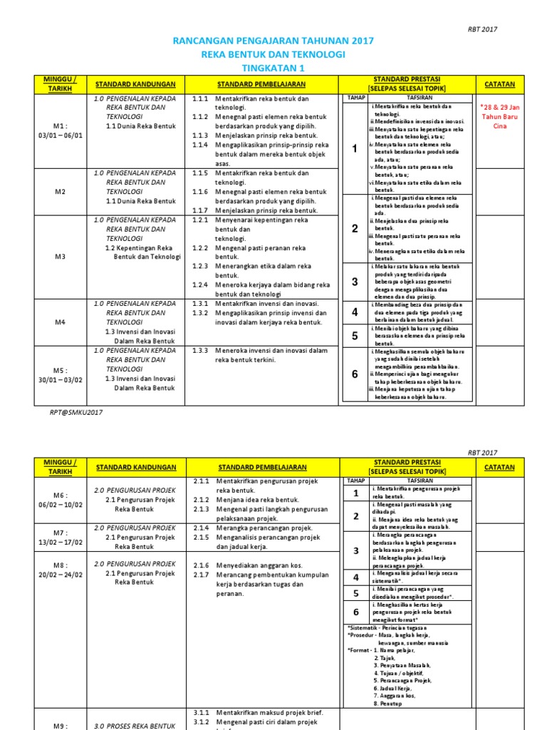 Rancangan Pengajaran Tahunan 2017 Reka Bentuk Dan Teknologi Tingkatan 1
