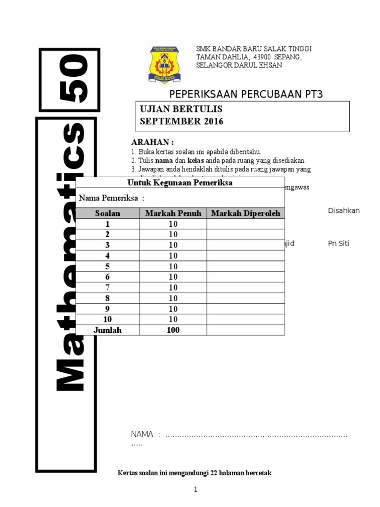 Soalan Percubaan Matematik Pt3 2016 Smkbbst