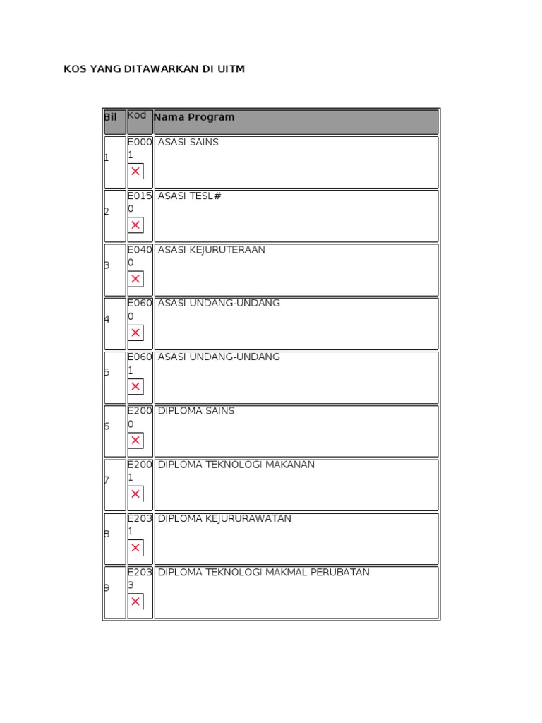 Kos Yang Ditawarkan Di Uitm Doc Document