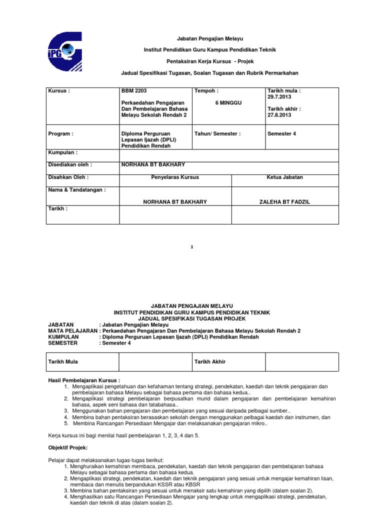 Jadual Spesifikasi Bbm 2203 Perkaedahan Pengajaran Dan Pembelajaran Bahasa Melayu Sekolah Rendah 2tugasan