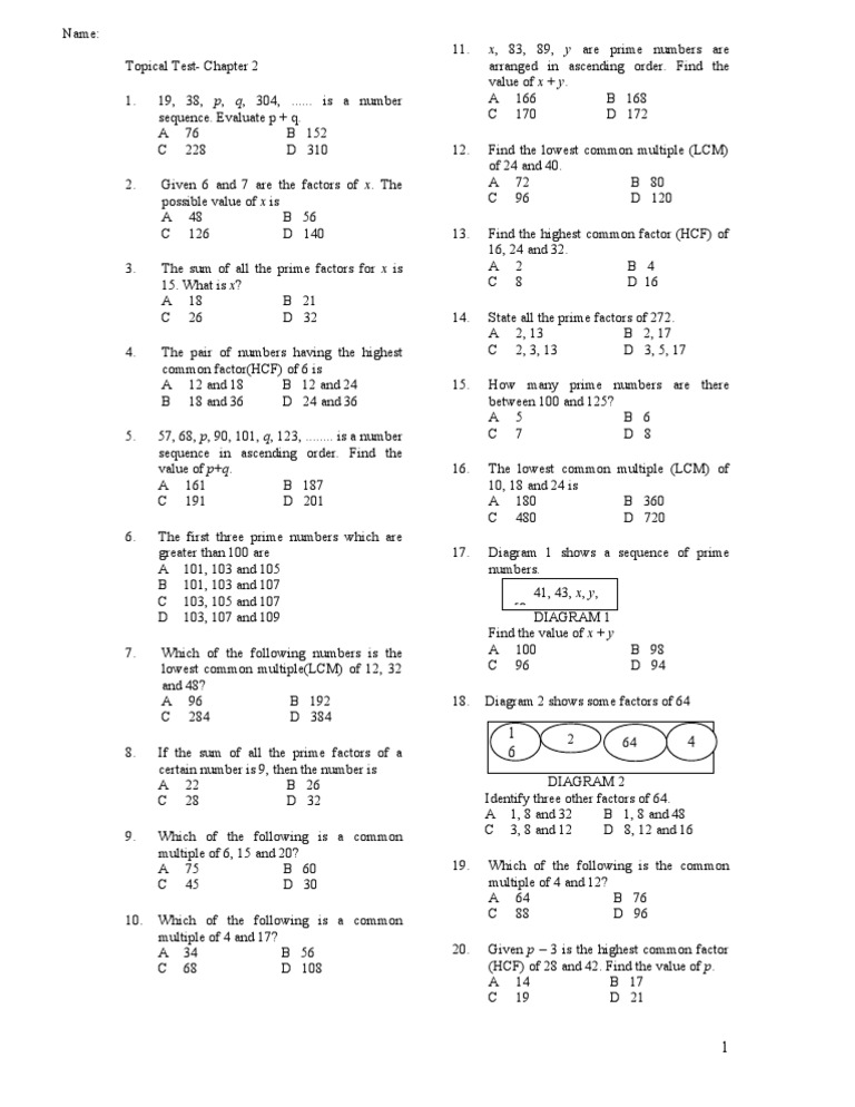 Chapter 2 Math Form 1 Topical Test Paper 1 Prime Number Mathematical Concepts