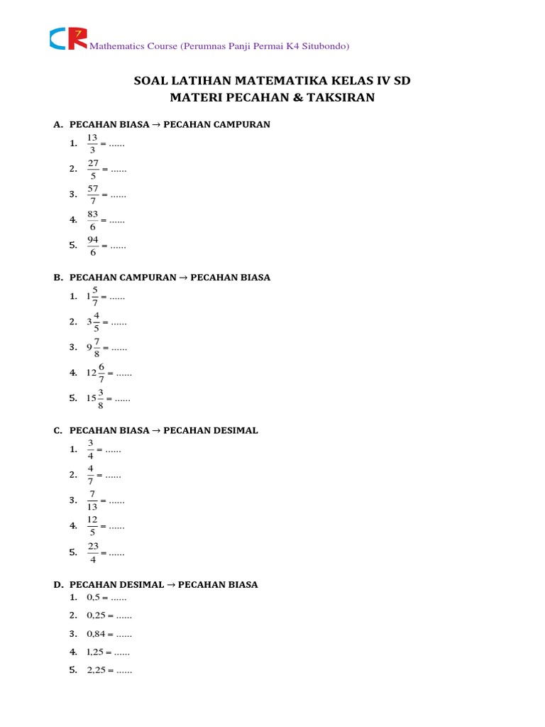 1 Soal Latihan Matematika Kelas Iv Sd Materi Pecahan Dan Taksiran Docx