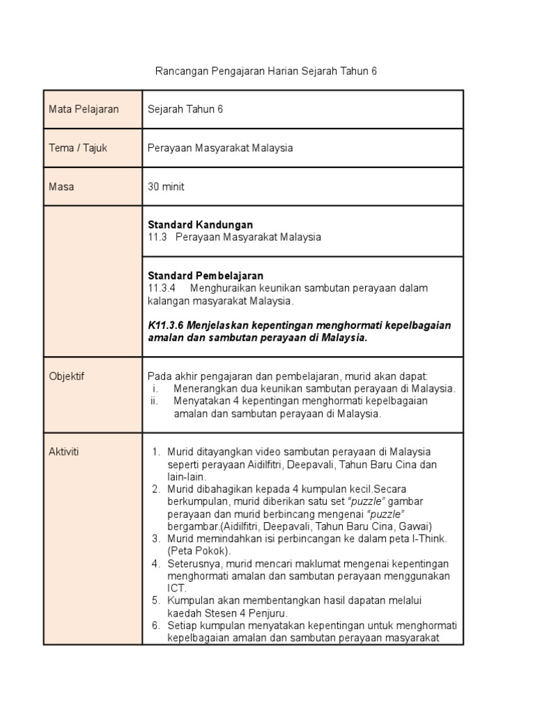 Rancangan Pengajaran Harian Sejarah Tahun 6