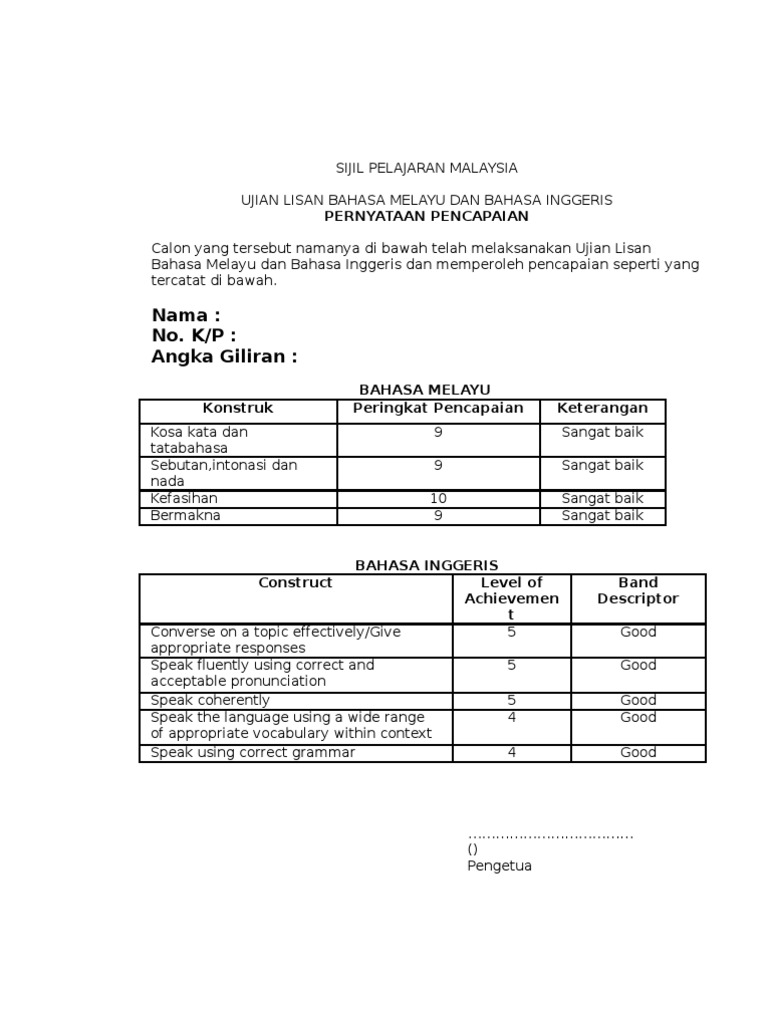 Markah Ujian Lisan Bahasa Inggeris Spm