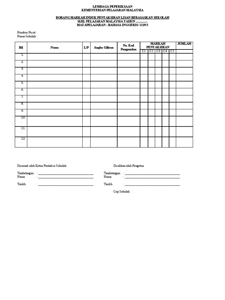Borang Markah Induk Plbs Bi Spm