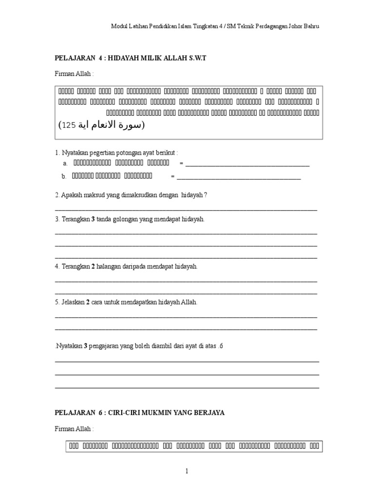 Pelajaran 4 Hidayah Milik Allah S W T Modul Latihan Pendidikan Islam Tingkatan 4 Sm Teknik Perdagangan Johor Bahru