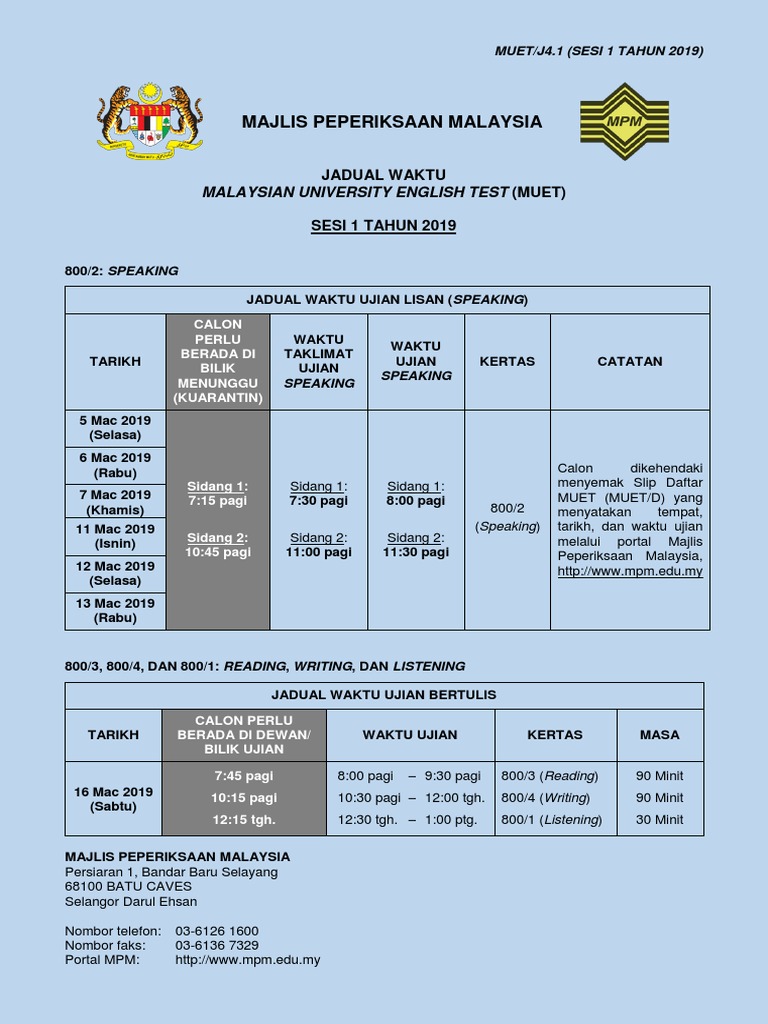 Muet J 4 1 Jadual Waktu Muet Sesi 1 2019