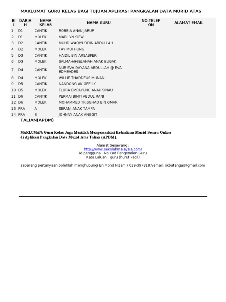 Maklumat Guru Kelas Bagi Tujuan Aplikasi Pangkalan Data Murid Atas Talian
