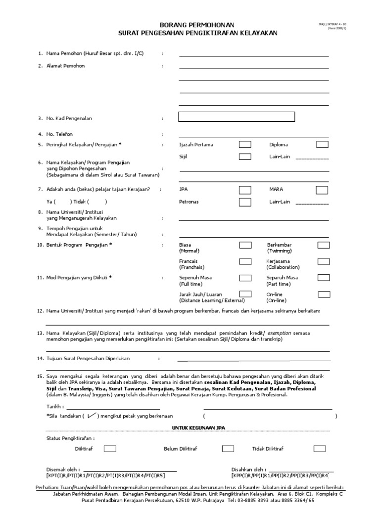Borang Permohonan Surat Pengesahan Pengiktirafan Kelayakan