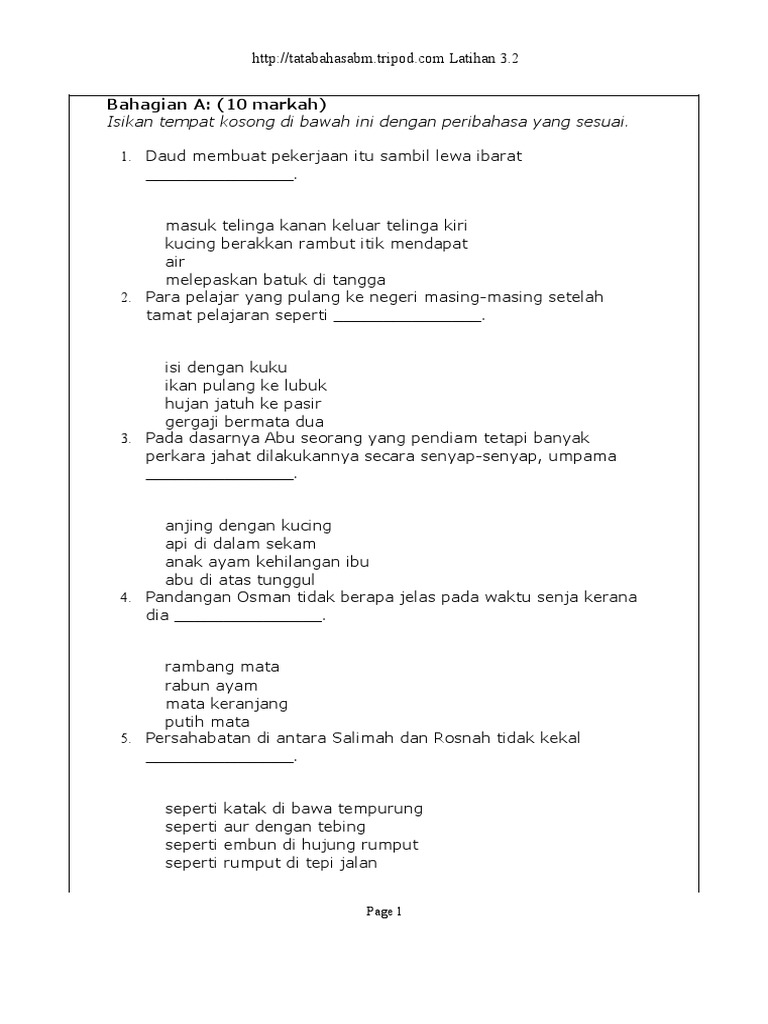 Latihan Peribahasa Dan Simpulan Bahasa Latihan 16 Soalan Objektif Perumpamaan