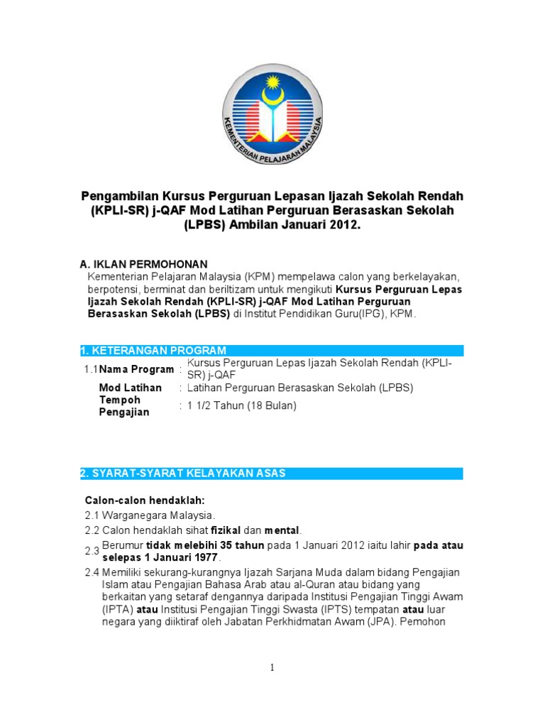 Pengambilan Kursus Perguruan Lepasan Ijazah Sekolah Rendah Kpli Sr J Qaf Ambilan Jan 2012