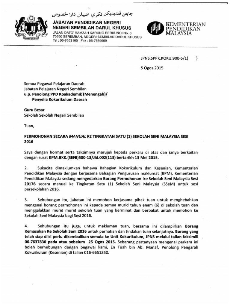 Surat Permohonan Secara Manual Ke Tingkatan Satu Sekolah Seni Malaysia Sesi 2015