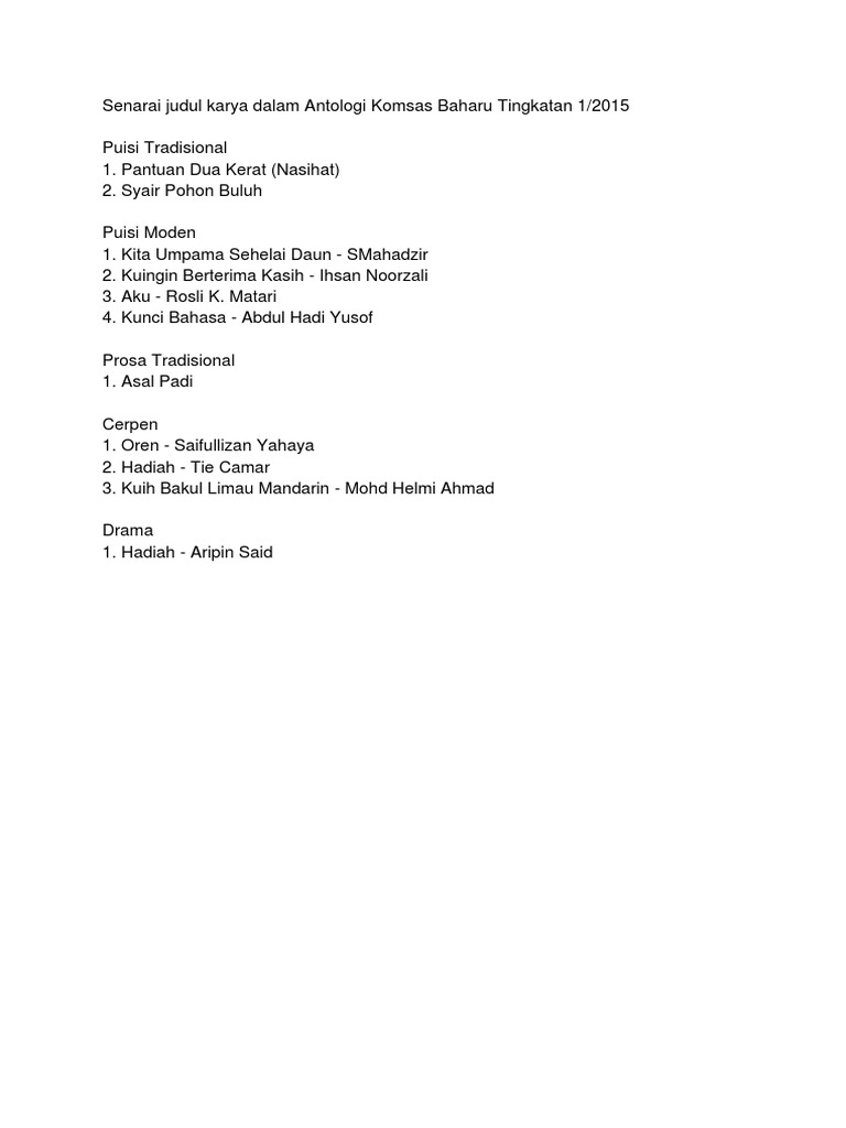 Senarai Judul Karya Komsas Tingkatan 1 2 3
