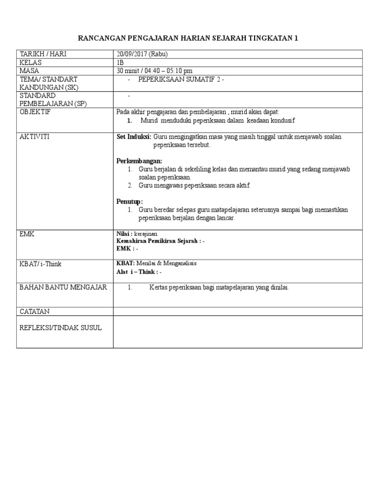 Contoh Rph Sejarah Kssm Tingkatan 1