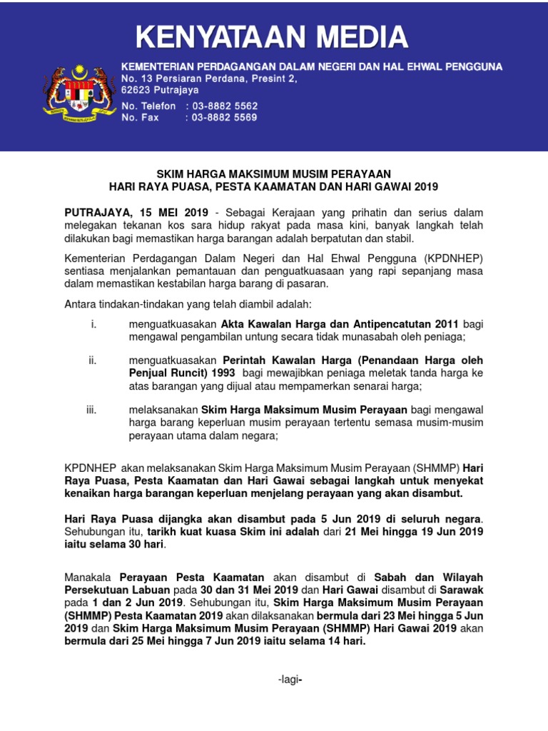 15 5 2019 Skim Harga Maksimum Musim Perayaan 2019 Hari Raya Puasa Pesta Kaamatan Hari Gawai Pdf