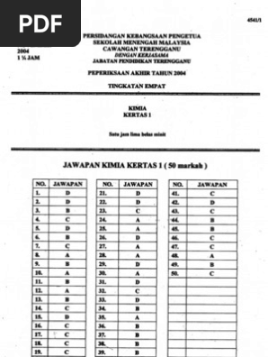 Skema Jawapan Kimia Tingkatan 4 Kertas 1