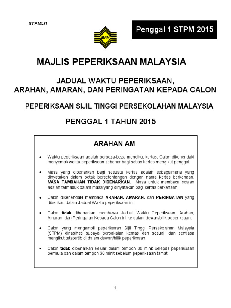 Jadual Stpm 2015 Penggal 1