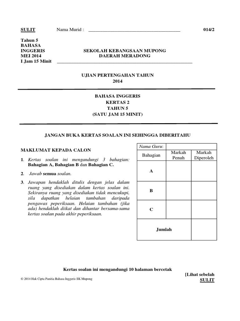 Cover Kertas Soalan Bahasa Inggeris Tahun 5 Paper 2