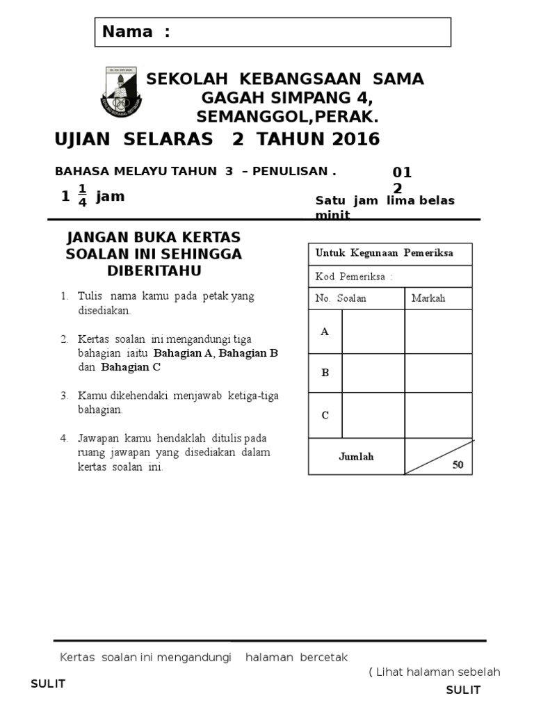 Contoh Kertas Peperiksaan Bahasa Malaysia Tahun 3 Kertas 2