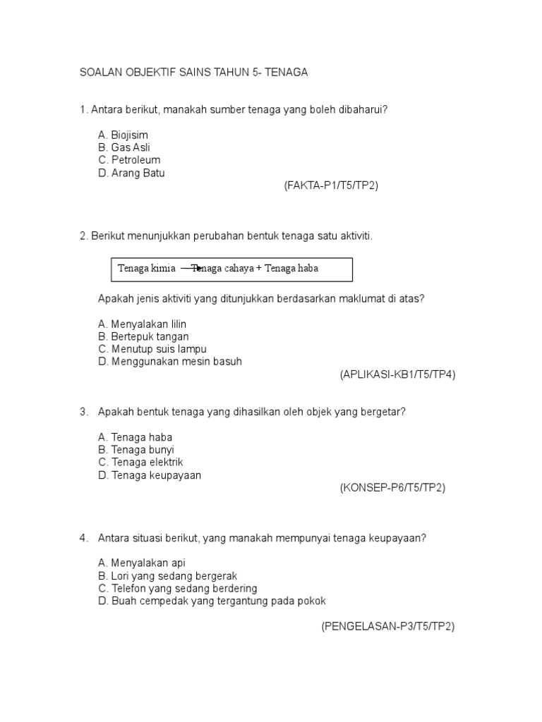 Soalan Latihan Sains Tahun 5 Tenaga