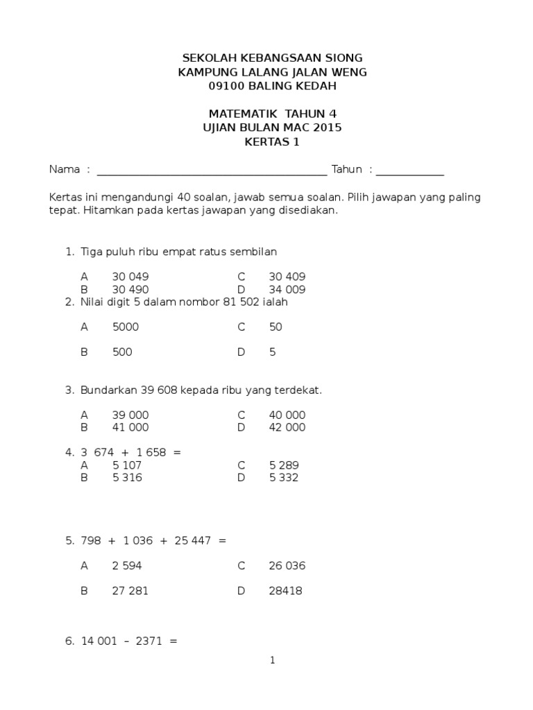 Kertas Soalan Matematik Tahun 4 Kertas 1 Kssr