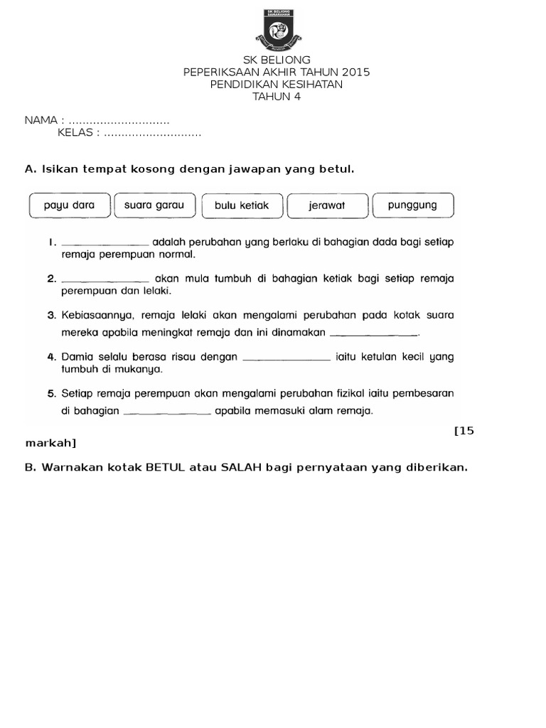 Soalan Peperiksaan Awal Tahun Pendidikan Kesihatan Tahun 4 Baik Soalan Ujian Pk Tahun 5 Skoloh