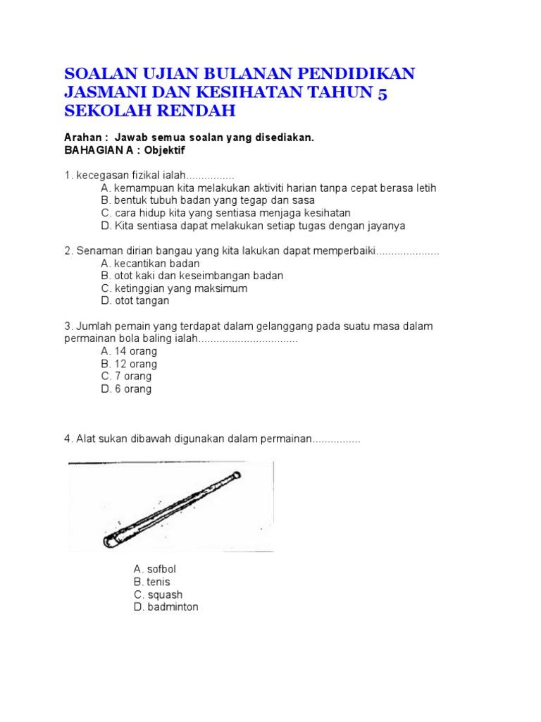 Soalan Ujian Bulanan Pendidikan Jasmani Dan Kesihatan Tahun 5 Sekolah Rendah Doc