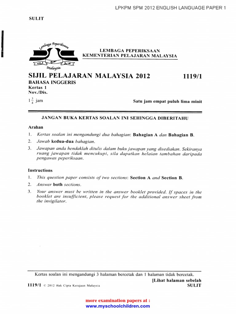 Lpkpm Spm 2012 Bahasa Inggeris Paper 1 K Student Assessment And Evaluation Schools