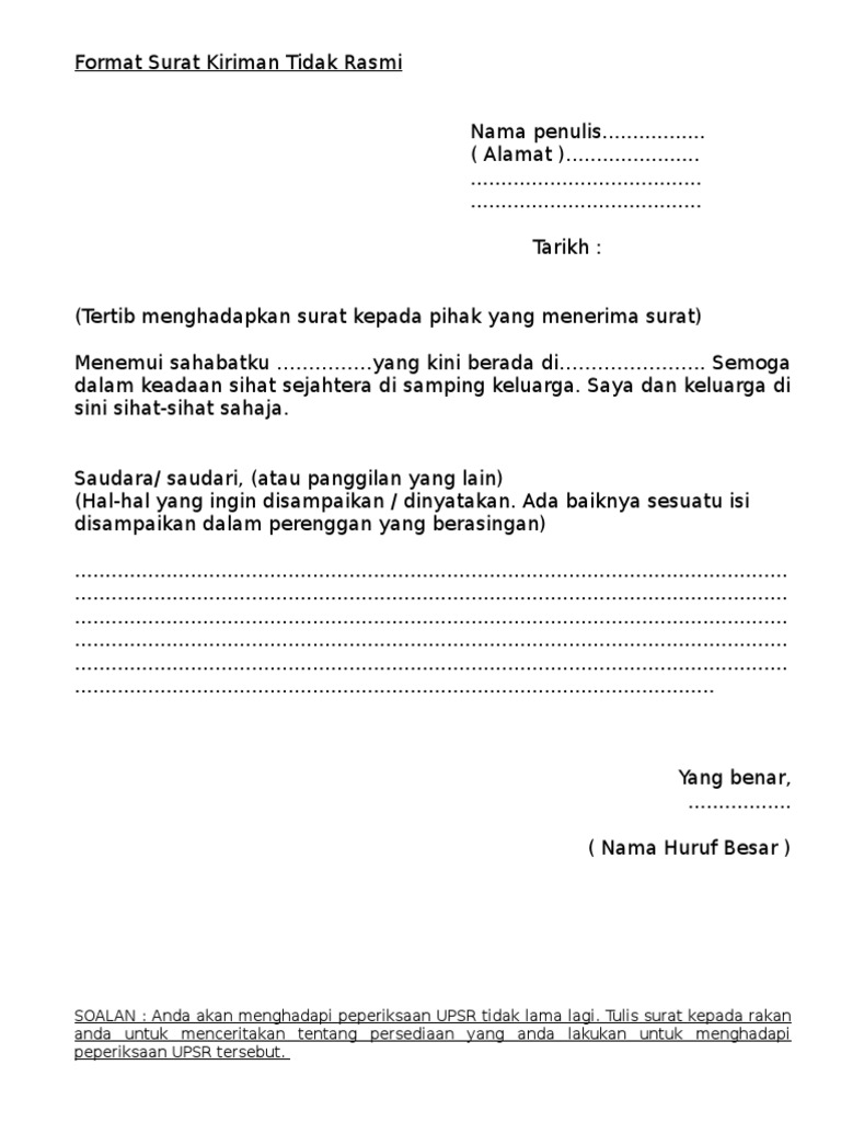 Contoh Format Surat Kiriman Tidak Rasmi Upsr Surasm