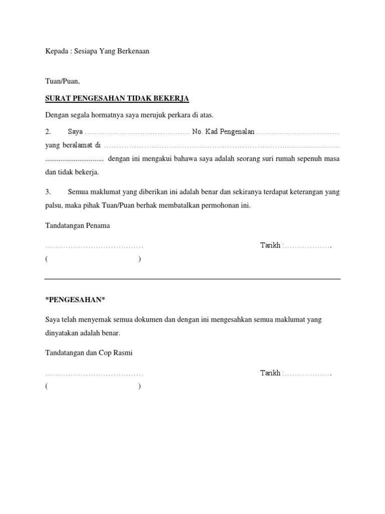 Surat Pengesahan Tidak Bekerja Suri Rumah Pdf