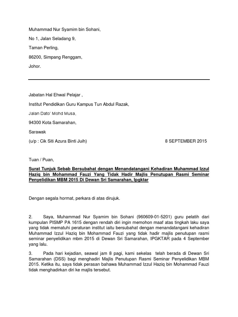 Contoh Surat Rasmi Tunjuk Sebab Kesalahan Hrasmi