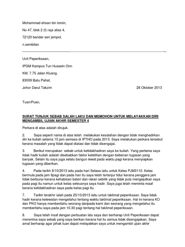 Contoh Surat Tunjuk Sebab Kelewatan