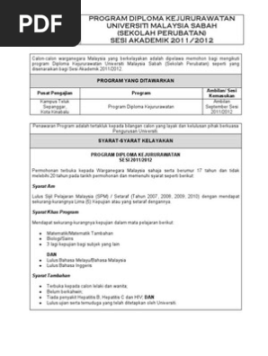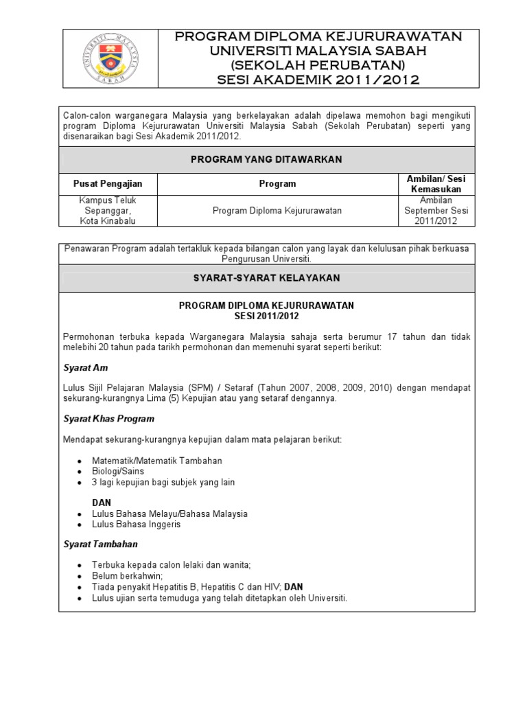 Program Diploma Kejururawatan Universiti Malaysia Sabah Sekolah Perubatan Sesi Akademik 2011 2012