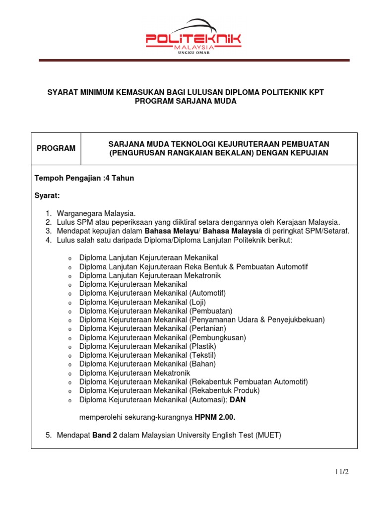 Syarat Minimum Kemasukan Bagi Lulusan Diploma Politeknik Kpt Program Sarjana Muda