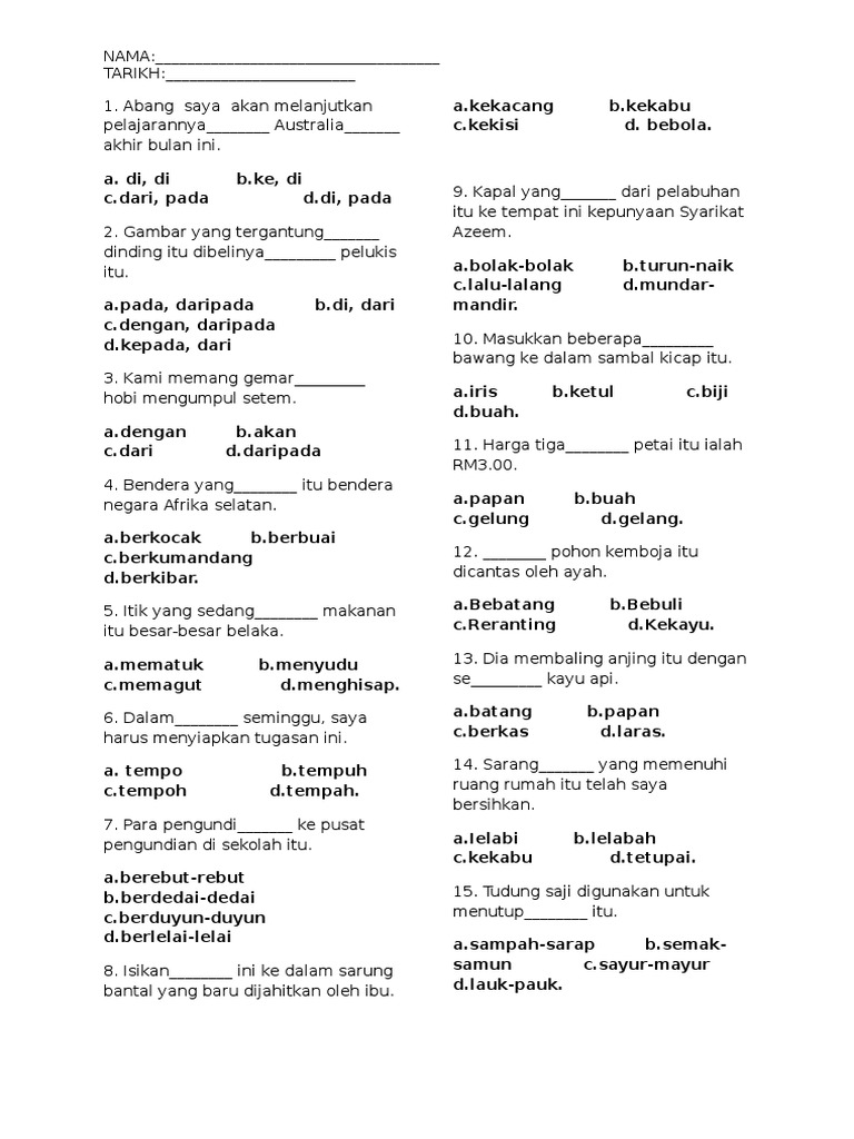 Soalan Bahasa Melayu Tingkatan 1 Objektif