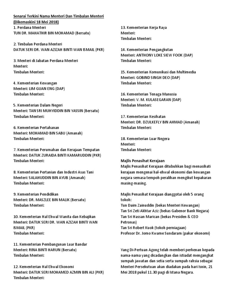 Senarai Terkini Nama Menteri Dan Timbalan Menteri