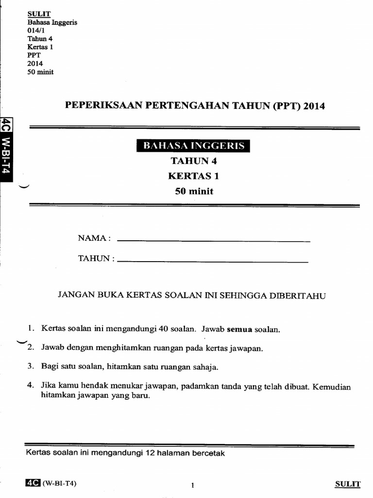 Kertas Ujian Bahasa Inggeris Tahun 4 Kssr Kertas 1