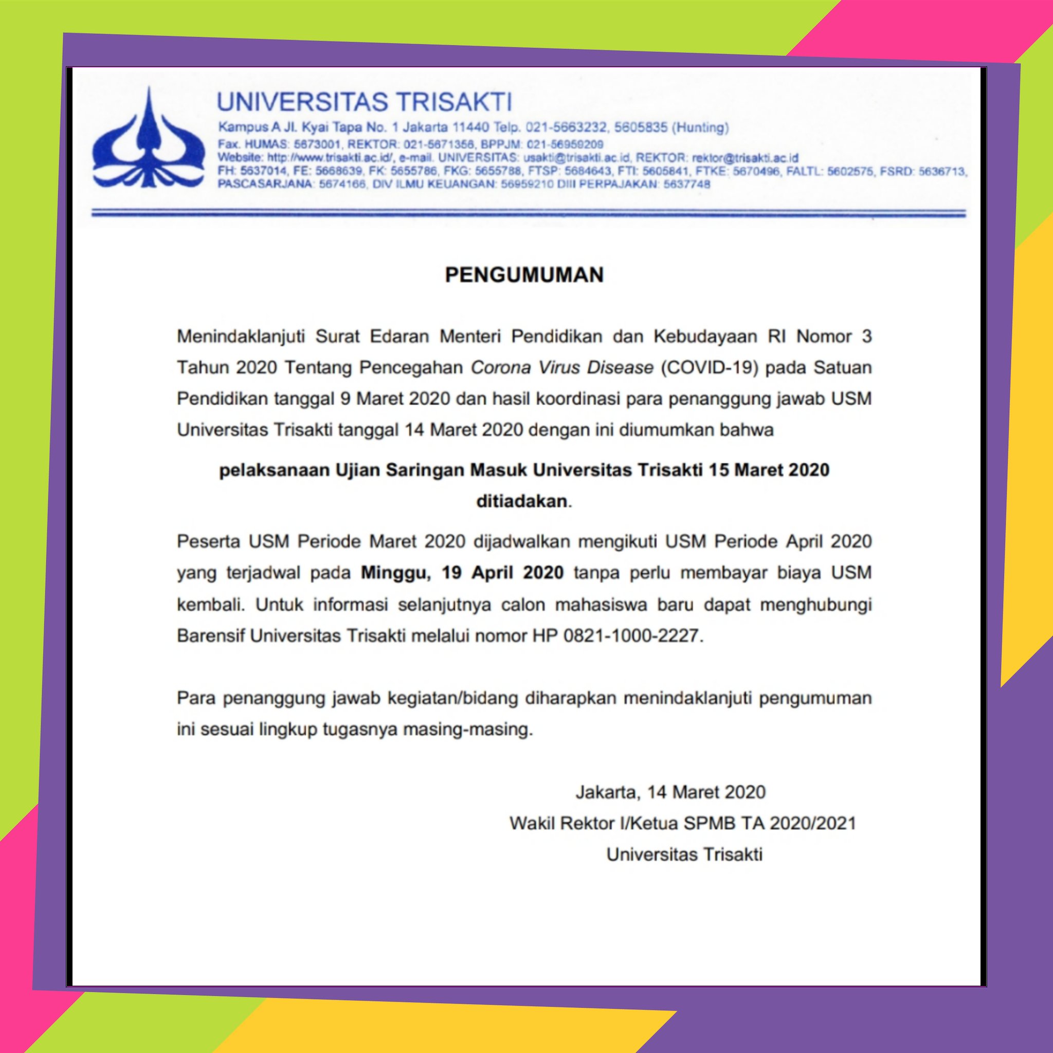 Universitas Trisakti On Twitter Pengumuman Pelaksanaan Ujian Saringan Masuk Universitas Trisakti 15 Maret 2020 Ditiadakan Peserta Usm Periode Maret 2020 Dijadwalkan Mengikuti Usm Periode April 2020 Yang Terjadwal Pada Minggu 19 April